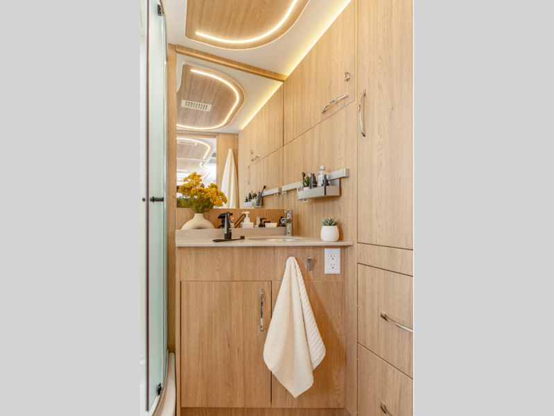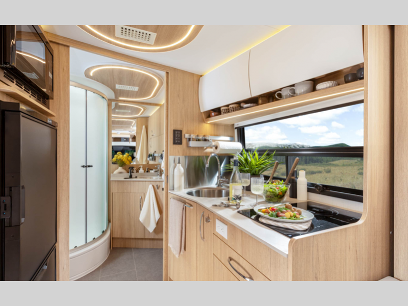 Sleeps 2 Slides 1 Length 25 ft 1 in Ext Width 7 ft 11 in Ext Height 10 ft 6 in Int Height 6 ft 4 in Interior Color Dove, Sand, Clay Exterior Color Alpine Mist, Sandstone, Shadow, Atlantic Blue, Carbon, Euro Sport, Granite, Storm Grey, Woodland GVWR 11030 lbs Fresh Water Capacity 25.6 gals Grey Water Capacity 35 gals Black Water Capacity 30.6 gals Furnace BTU 19000 btu Fuel Type Diesel Engine 2.0-L Turbocharged I-4 Diesel Chassis Mercedes-Benz Sprinter 3500 Horsepower 208 hp Fuel Capacity 24.5 gals Wheelbase 170 in Available Beds Murphy Torque 332 ft-lb Refrigerator Type 12V Compressor Refrigerator w/Bottom Freezer Convection Cooking Yes Cooktop Burners 2 Number of Awnings 1 LP Tank Capacity 15.8 gals Water Heater Type Truma AquaGo Comfort Plus AC BTU 13500 btu Basement Storage 39 cu. ft. TV Info Coach 40" Smart TV with Lift Awning Info Powered Legless Box w/Wind Sensor and LED Ligts Shower Type Radius Similar Floorplans